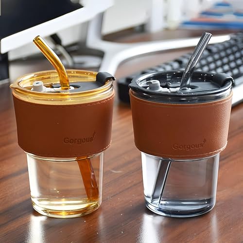 Generic - حاوية قهوة محمولة - كوب زجاجي قوي سعة 450 مل مع غطاء واقي وقشة، غطاء مانع للتسرب للمشروبات الساخنة، مثالي للاستخدام اثناء التنقل والانشطة الخارجية (قطعتان)
