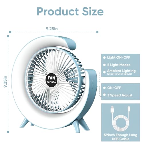 Generic - مروحة مكتب محمولة - مروحة طاولة 5 انش قابلة لاعادة الشحن بمنفذ USB مع اضواء LED RGB و3 اعدادات للسرعة وامالة 180 درجة، تبريد فائق الهدوء لغرفة النوم او المكتب او التخييم
