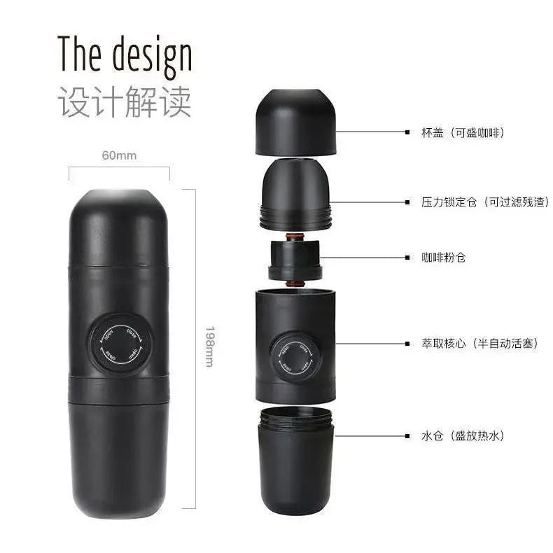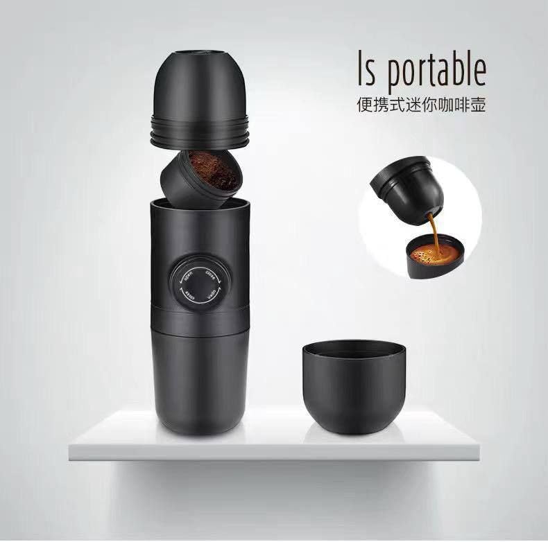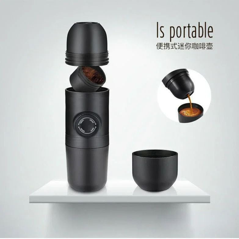Miniespresso - ماكينة إسبرسو محمولة للسفر، ماكينة صغيرة الحجم تعمل بالضغط اليدوي أثناء التنقل متوافقة مع مسحوق الإسبريسو