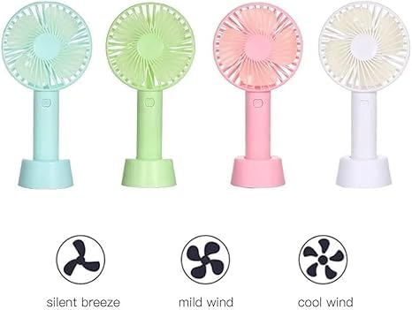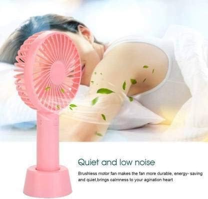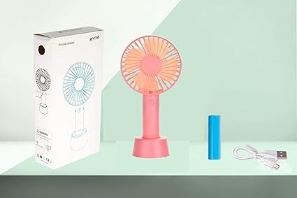 - ٢) التصميم: مروحة محمولة وردية اللون بتصميم أنيق، مع قاعدة ثابتة للاستخدام المكتبي