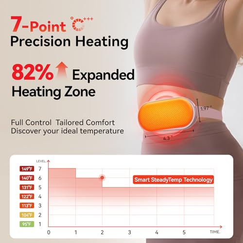 - 7-Level Heating and Vibration:The 7 adjustable heat settings and vibration modes target lower abdomen discomfort directly. Say goodbye to cramps! Note: The heating pad for the first use, we suggest starting from lowest temperature level sensing technology, providing soothing heat toeffectively alleviate menstrual discomfort