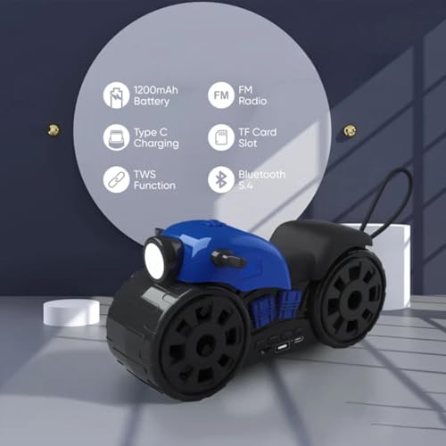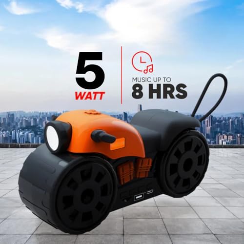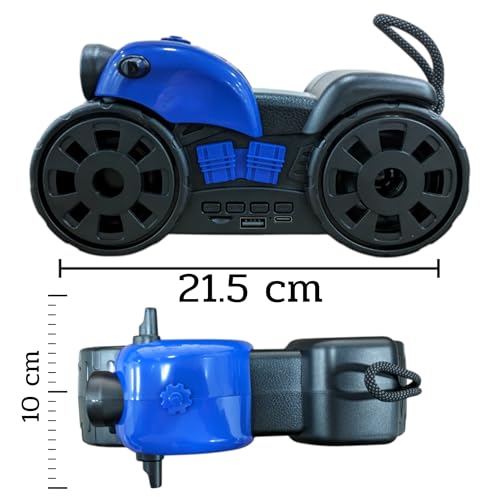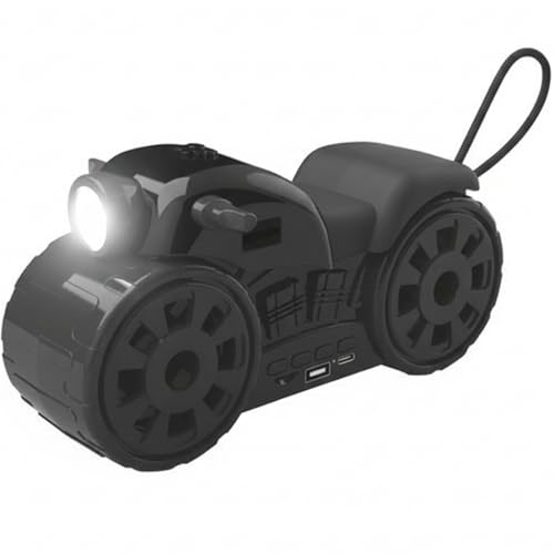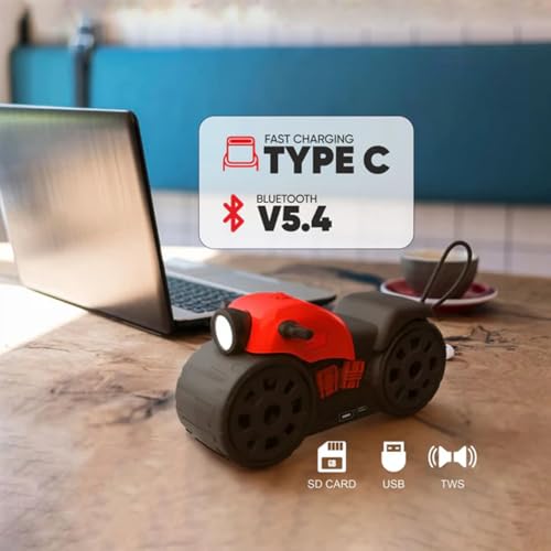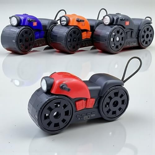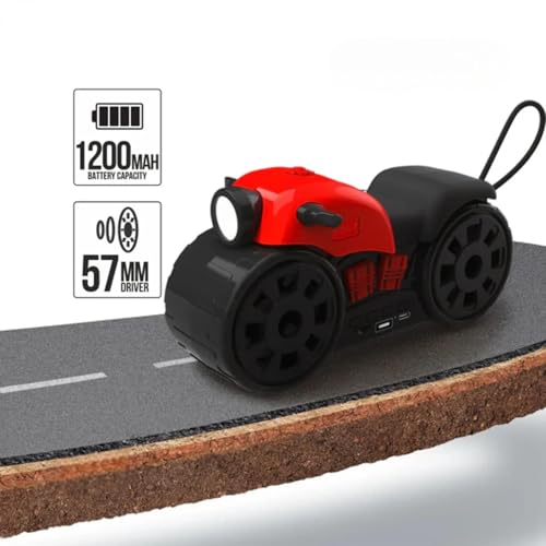 - DESIGN: Unique motorcycle-shaped portable speaker with built-in LED light, combining style with functionality