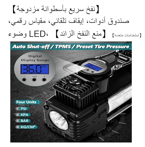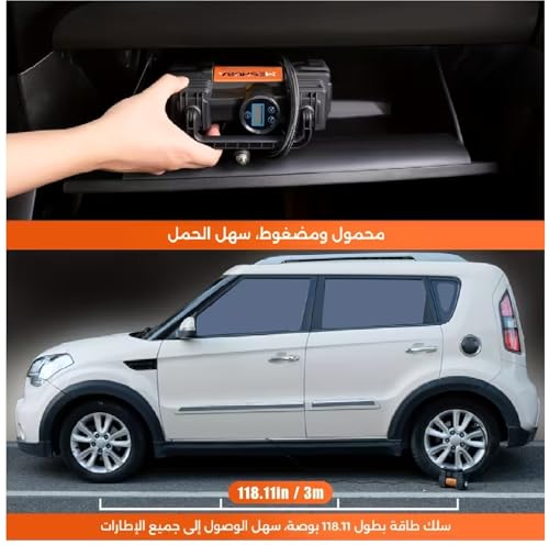 - معلومات هامة: 1. يعمل ضاغط الهواء LED, ,على 12 فولت فقط. 2. تم توفير حقيبة لحمل جميع الملحقات وتنظيمها في حال فقدانها.3 LED Light, يمكن تخزين هذه الحقيبة بسهولة في صندوق سيارتك للوصول السريع