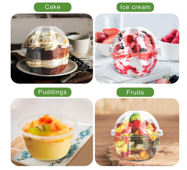 - Plastic cups with lids includes 50 plastic cups, 50 dome lids no hole and 50 individually packaged sporks, 9oz is the suitable size for ice creams and desserts