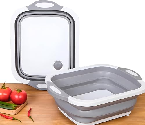 OVA - لوح تقطيع متعدد الأغراض قابل للطي للمطبخ، لوح تقطيع، وعاء غسيل للفواكه والخضروات، سلة تصريف مع سدادة، غسيل مريح في الحوض