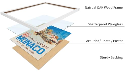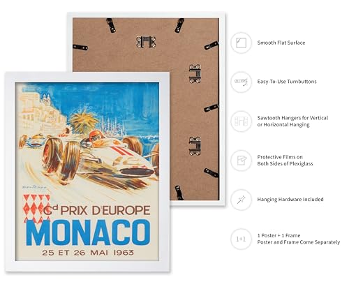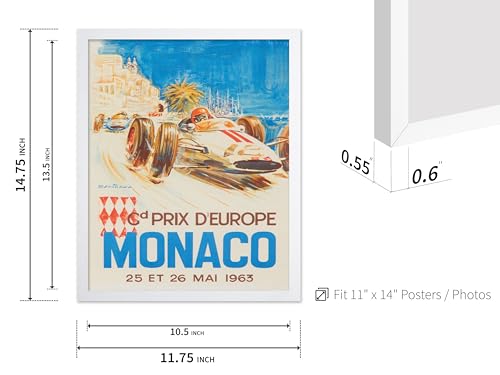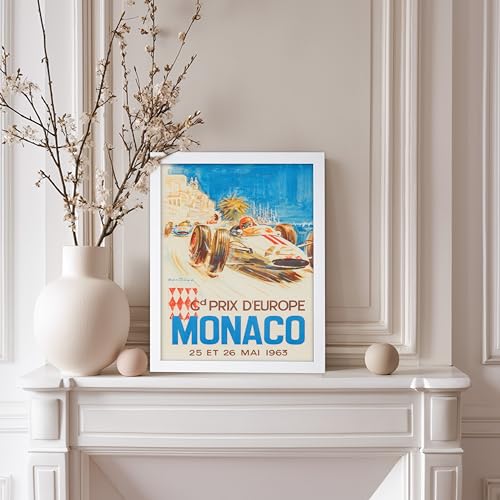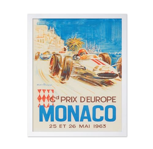 Poster Master - بوستر بتصميم سباق سيارات ماستر موناكو - لوحة فنية جدارية عتيقة F1، لملصق سباق السيارات 1963، ديكور حائط رائع للمنزل والمكتب وغرفة المعيشة، 36 × 28 سم، أبيض، مؤطر