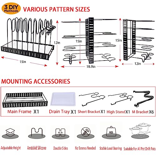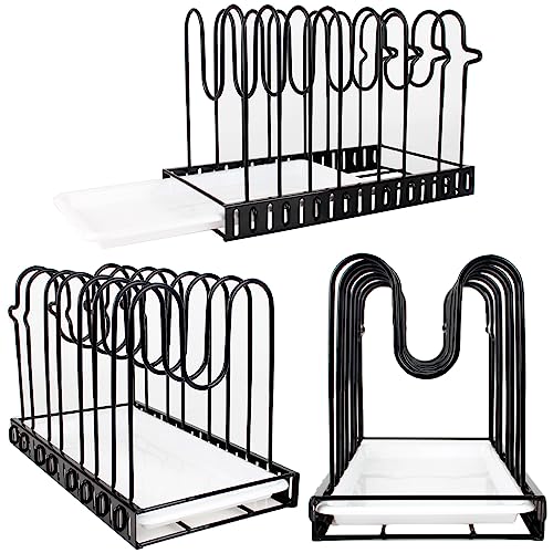 - 【رف منظم للأواني تحت الخزانة】منظم غطاء وعاء متعدد الاستخدامات وقابل للتخصيص مثالي لأي مطبخ. يسمح تصميمه القابل للتعديل، وإمكانية الوضع على الجانبين، ووضعيات التركيب الذاتي بملاءمته لأي مساحة بسهولة، بينما تساعد ملحقاته وصينية التصريف في الحفاظ على أواني الطهي نظيفة وجافة، وهو رف لتنظيم الحلل تحت الخزانة، ومنظم لخزائن المطبخ وأغطية القدور، ومنظم لما تحت الخزائن.