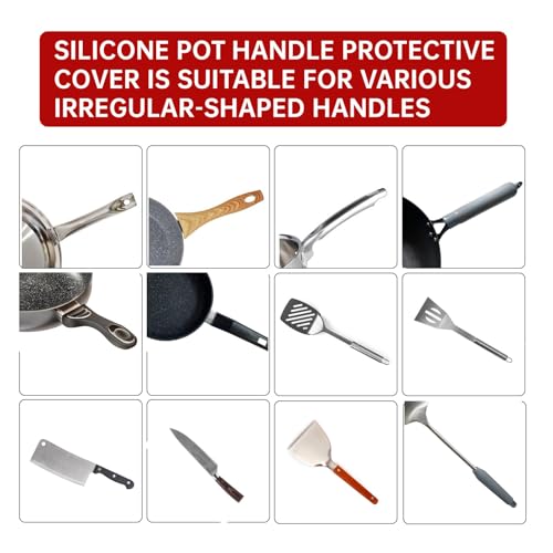 - [Perfect Fit] Our silicone pot handle covers will automatically shrink to fit various irregularly shaped handles. You no longer have to worry about the pot handle cover falling off inappropriately and affecting use. It completely protects your kitchen utensil handles and effectively prevents Scald for peace of mind when cooking.