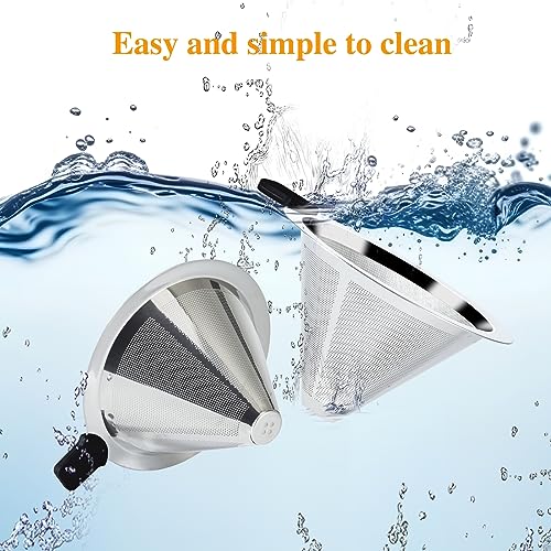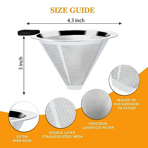 - ☕️【Double Mesh Design】The coffee filter is made of top quality 304 stainless steel without using paper filters. The bottom is integrated with the filter element, can be placed smoothly on the cup. The dual coffee filter brewing design prevents any coffee grounds from passing, no grounds end up in your cup.