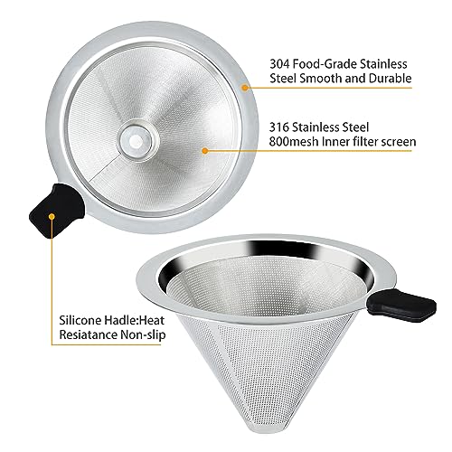 YMMIND - Pour Over Coffee Dripper Slow Drip Paperless Coffee Filter, Double Mesh Stainless Steel Pour Over Coffee Maker for Single Cup Brew Reusable Cone Filter, Coffee Drip Cone, Fine Mesh Strainer(3-4 Cup)