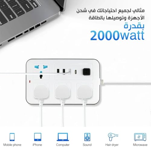 - وصلة تمديد كهربائية 8 في 1 3 متر: 4 مقابس طاقة و3 منافذ USB ومنفذ شحن واحد من النوع C بي دي في وصلة تمديد واحدة تمكنك من تشغيل 8 أجهزة في وقت واحد، مثالي لشحن أجهزة متعددة في المنزل والمكتب والمرآب وأنظمة الترفيه. يمكن أن يزود محول الطاقة إلى ما يصل 2500 واط وتكون المسافة بين المنافذ الكهربائية منفصلة بما يكفي لتناسب المقابس الكبيرة دون حجب بعضها البعض.