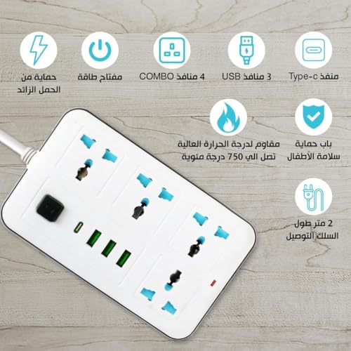Generic - مقبس تمديد الطاقة، شريط طاقة مع USB، 3 منافذ USB و1 نوع C | مفتاح طاقة مستقل، اقصى 1 امبير، حماية من الحمل الزائد وسلامة الأطفال، سلك تمديد بطول 2 متر، الموديل: 633