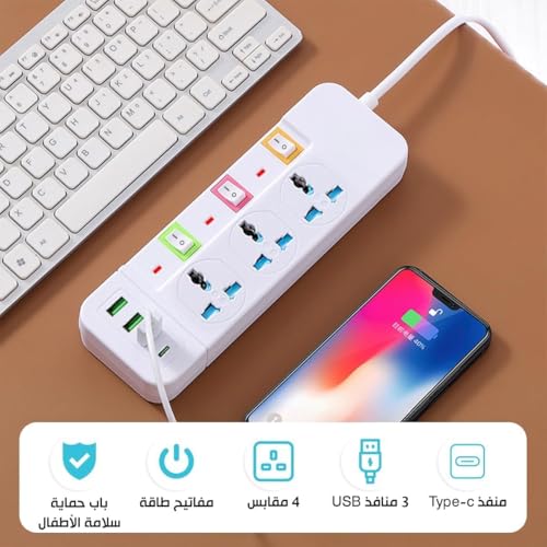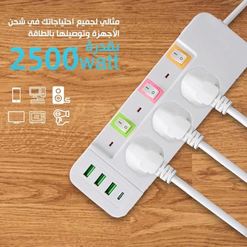 Generic - مقبس تمديد مشترك الطاقة 2500 وات مع 3 منافذ USB، 1 نوع سي، 3 مفاتيح مستقلة، واقي من اندفاع التيار وحماية من الحمل الزائد، محول متعدد المقابس للشحن المنزلي والمكتب، GS-3