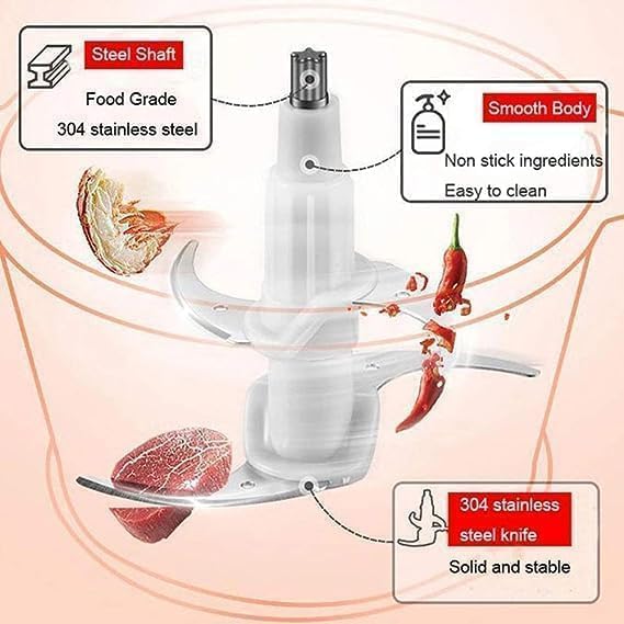 - 🔪 2️⃣ Food-Grade 304 Stainless Steel Blades Double-layer stainless steel blades with solid steel shaft ensure stable operation, precise cutting, and long-lasting sharpness without rust.