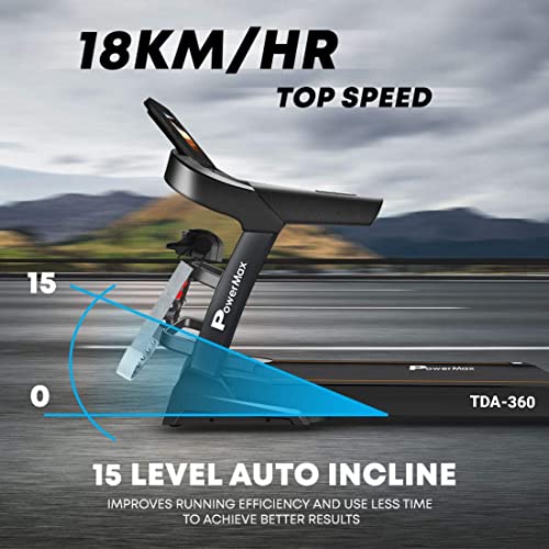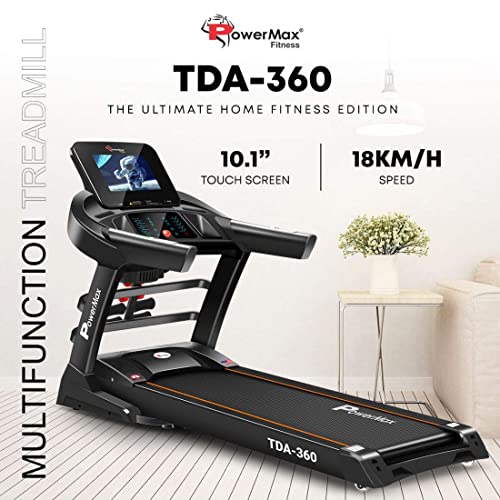 PowerMax Fitness - جهاز مشي كهربائي متعدد الوظائف TDA-360 10.1 بوصة يعمل باللمس 6.0 حصان للذروة من باورماكس فيتنس تزييت تلقائي انحدار وللاستخدام المنزلي اسود