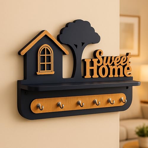 D Unique Home Decor - حامل مفاتيح خشب ثلاثي الأبعاد مع 6 خطافات من الفولاذ المقاوم للصدأ لتزيين حائط غرفة المعيشة