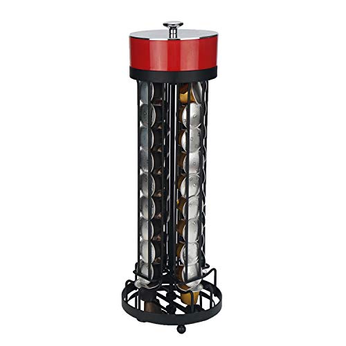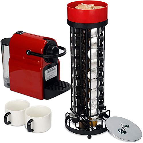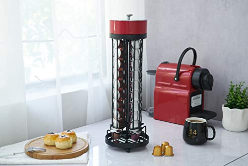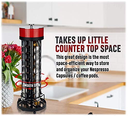 - ** HOLDS 40 NESPRESSO PODS: This rotating carousel rack is designed to hold 40 original-size coffee pods. The four sections hold up to 10 capsules each. The additional space on top can be used to keep sugar, tea bags, a different type of capsules, etc