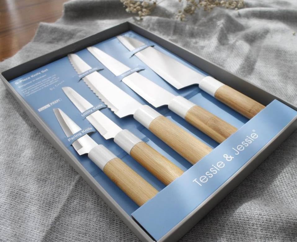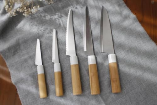 - PREMIUM SET: Complete 5-piece kitchen knife set featuring durable stainless steel blades with elegant wooden handles for versatile food preparation