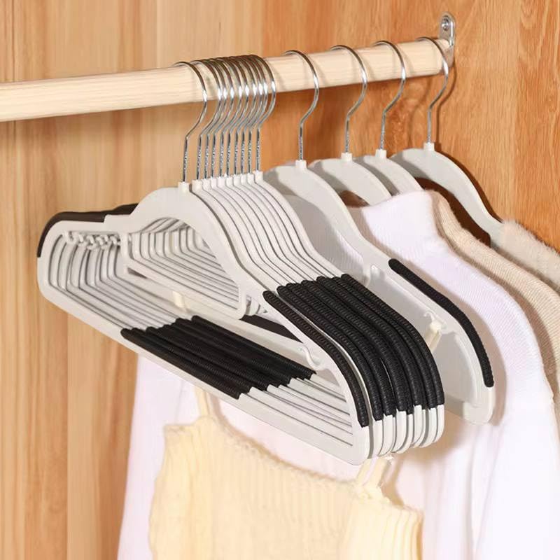 - بلاستيك قوي مع مقبض سيليكون مضاد للانزلاق: مصنوعة من بلاستيك عالي الجودة وشديد التحمل، تتميز هذه الشماعات بحواف سيليكون مضلعة تمنع الملابس من الانزلاق أو السقوط. يضمن هذا التصميم بقاء الملابس في مكانها بأمان مع الحفاظ على شكلها ومظهرها الأصلي.