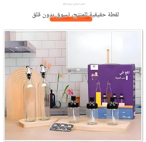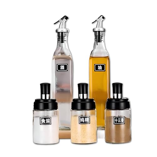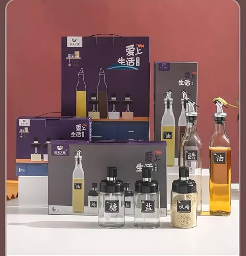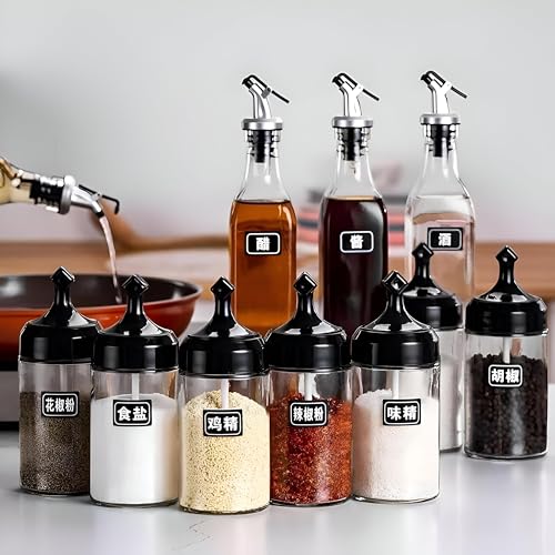 - This 7-piece glass spice and oil set transforms your kitchen into a sleek, organized haven, blending elegant design with functional practicality, elevating the overall cooking environment with its modern aesthetic.