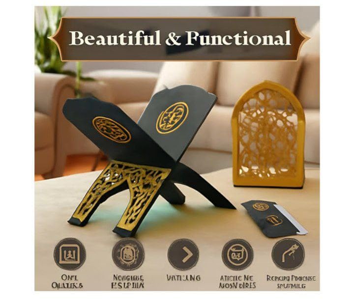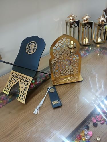 - مجموعة حوامل مصحف فاخرة من 3 قطع: تتضمن هذه المجموعة الكاملة حامل مصحف مفتوح وحامل مصحف مغلق وفاصل إشارات مرجعية مطابقة للقرآن، مما يوفر كل ما تحتاجه للتلاوة والتخزين اليومي. مصممة بطابع إسلامي فاخر باللونين الأسود والذهبي، تضيف هذه المجموعة الأناقة والجمال الروحي إلى أي منزل أو مسجد أو غرفة صلاة.