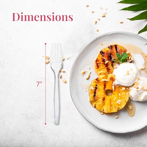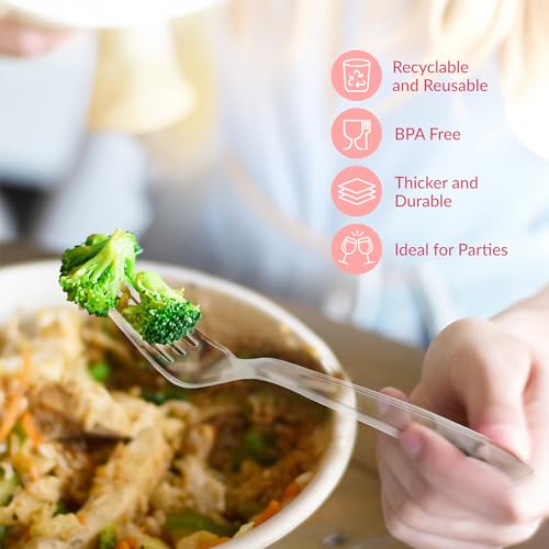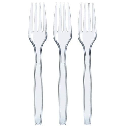 - ELEGANTLY CLEAR DESIGN: Prestee presents a set of 100 clear plastic forks heavy duty, each boasting an elegant crystal clear shine that effortlessly complements any table decor.
