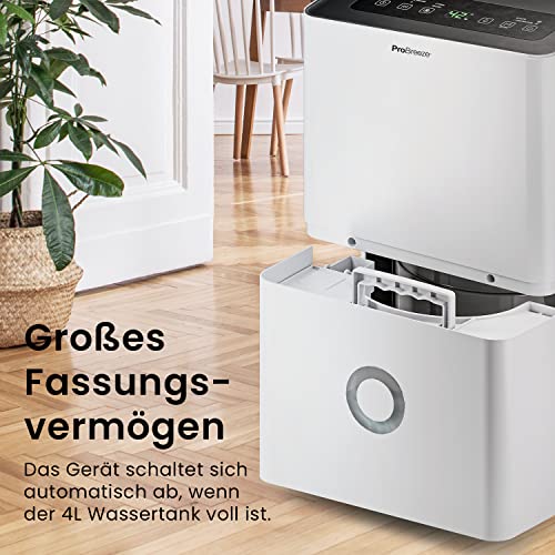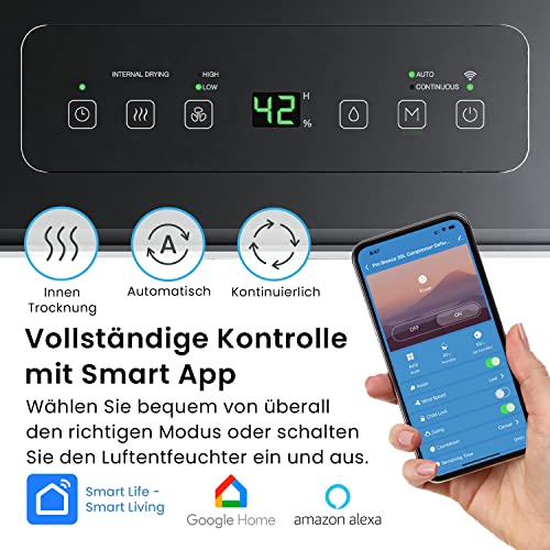 - WITH APP & DIGITAL CONTROL PANEL: With this efficient Pro Breeze Smart Dehumidifier for home, you can control the humidity level in your home. You can set the desired humidity level, set a 24 hour timer or choose from 3 modes, including automatic dehumidification, continuous dehumidification and internal drying, using the user-friendly digital control panel on the dehumidifier or the Pro Breeze smart app.