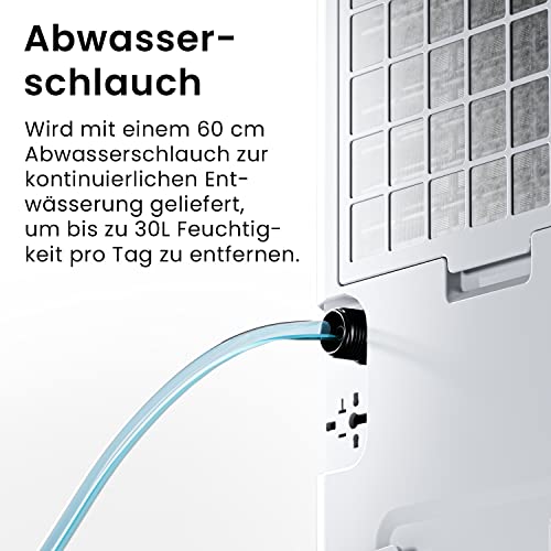 - 30 LITER/DAY & LARGE WATER RESERVOIR: The spacious 4 litre water tank switches off automatically when full. The electric dehumidifier has a drain hose to drain up to 30 litres of moisture and condensation per day, without the need to empty the tank. Four built-in wheels make this portable dehumidifier with drain easy to move between the bedroom, bathroom and office.
