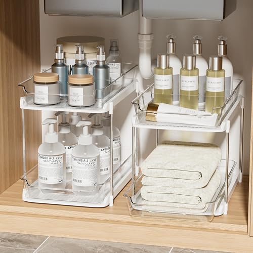 generic - منظمات وتخزين تحت الحوض للحمام من طبقتين من برواريا، منظم خزانة مطبخ شفاف قابل للتكديس، منظم خزانة ادوية قابل للسحب، مجموعة من قطعتين