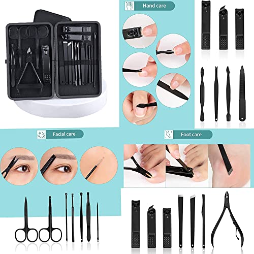 CBEI - Profession Nail Clippers Set 18 pcs,Black Stainless Steel Sharp Nail Trimmer Pedicure and Manicure Set with Cortex Metal Case for Men and Women