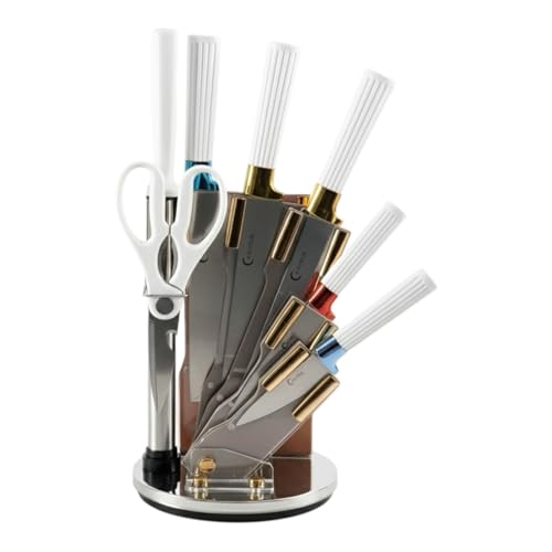 - FULL - Luxury & Contemporary Swivel Base Design:8-piece professional kitchen knife set with elegant design including rotating base combines beauty and functionality to make every tool easy to access with a luxurious decorative look for your kitchen.