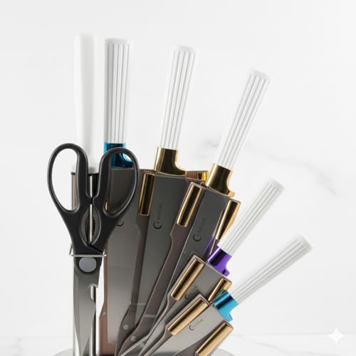 Generic - Professional 8 Piece Kitchen Knife Set with Elegant Rotating Base, Stainless Steel Blades in Premium Metallic Colors, Includes Scissors and Sharpener, Luxury Modern Design (White)