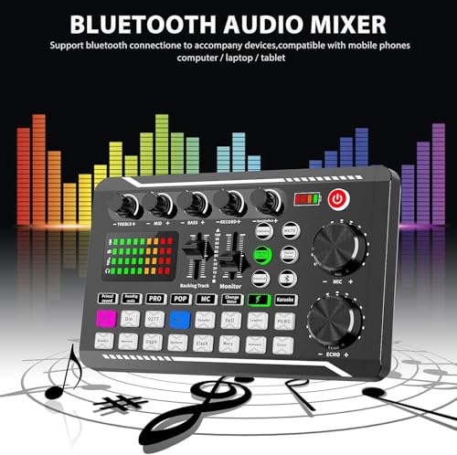 - 【Professional F988 Sound Card】Experience top-quality sound with our latest F988 Live Sound Card! Designed with an imported DSP dual chip, Bluetooth wireless accompaniment, double thruster precise adjustment and an advanced intelligent light control system that will light up your concert to the rhythm of the music making it even more exciting. The console lights can be operated by the Lightning logo on the console.