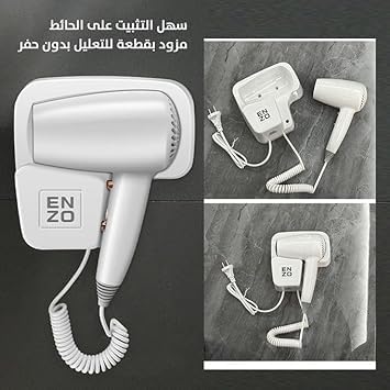 - يتميز بتصميم موفر للمساحة مع حامل جداري يُثبت بدون حفر، مناسب للحمامات أو غرف الفنادق، ويساعد على الحفاظ على ترتيب المكان مع سهولة الوصول إلى المجفف عند الحاجة.