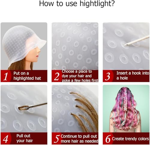 - · Durable and Reusable: Crafted from high-quality silicone, our highlight cap is washable, reusable, and built to last. Say goodbye to disposable options and embrace an eco-friendly approach to hair dyeing.