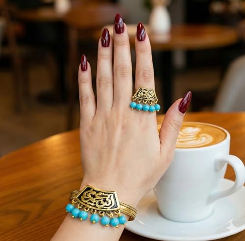 Generic - طقم نحاس بيور مكون من أسورة وخاتم فري سايز ومطعم بأحجار الفيروز مناسب للهدايا ، للنساء
