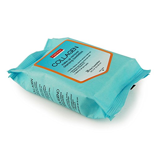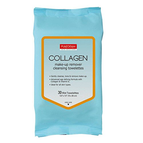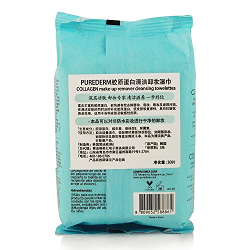 Purederm - مناديل مبللة منظفة ومزيلة للمكياج (30 منديل - بخلاصة الكولاجين، من بيور ديرم، أزرق