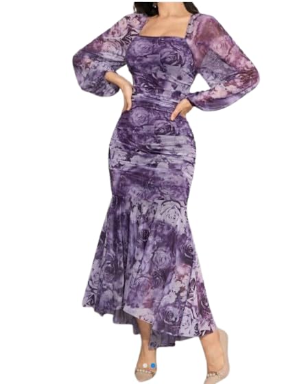 Generic - Purple Floral Print Mermaid Maxi Dress, Long Sleeve, Square Neck, Ruched Bodycon Formal Gown