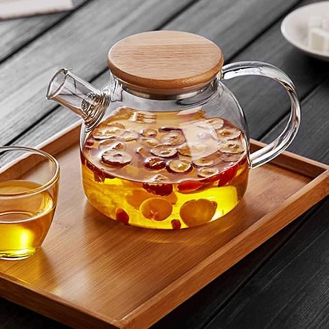 Spaceshoop - Pyrex Thermal Glass Teapot (1L) with Bamboo Lid & Rustproof Infuser & Glass Water Jug Perfect for Fruit Tea Container and Teapot