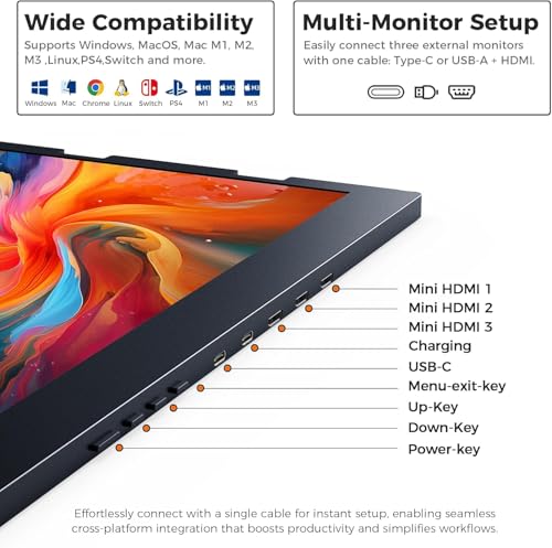 - إعداد التوصيل والتشغيل بكابل واحد - سهل وفعال: قم بتبسيط إعدادك باستخدام كيبل USB نوع C أو USB-A واحد فقط يعمل ويربط جميع الشاشات الثلاث أو الأربع في وقت واحد. متوافق مع ويندوز وماك او اس ومعظم أجهزة اللاب توب من 13.6 انش إلى 17.3 انش، يوفر موسع شاشة اللاب توب 3 شاشات راحة سلسة للتوصيل والتشغيل دون صداع السائق. (يتطلب منفذ USB-C أو ثاندربولت كامل الميزات للحصول على أفضل أداء.)
