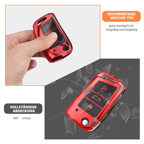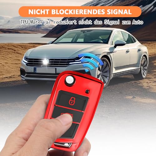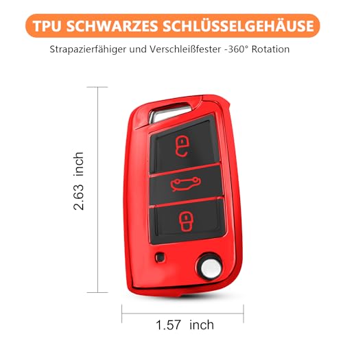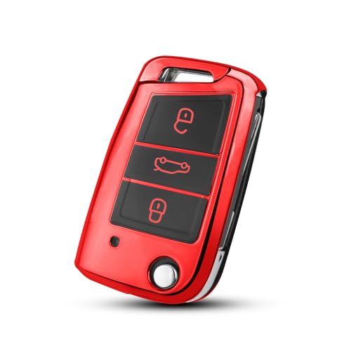 QBUC - جراب لمفتاح السيارة من كيو بي يو سي لسيارة فولكس فاجن جولف 7 وبولو وسكودا، جراب للمفتاح ب 3 ازرار مصنوع من البولي يوريثين الحراري المضاد للخدش (احمر)