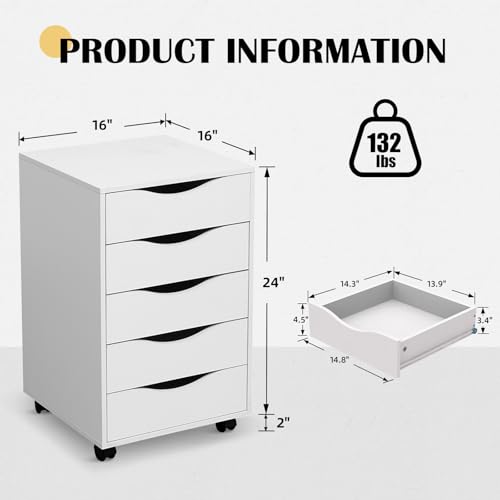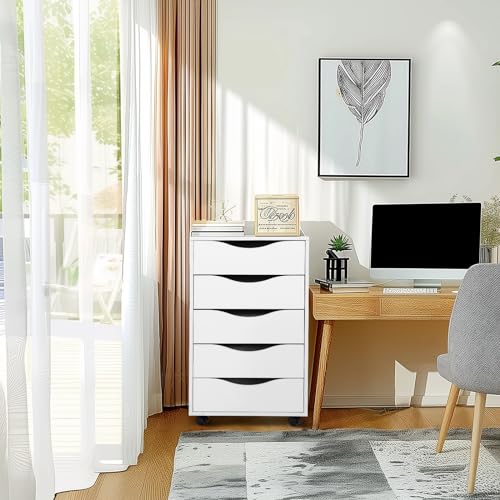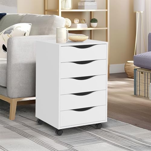 QDSSDECO - مكتبة ملفات خشبية من 5 أدراج دوارة مع عجلات للمكتب المنزلي من كيو دي اس دي دي يو، أبيض