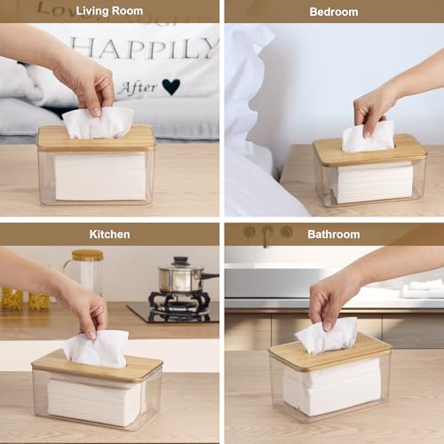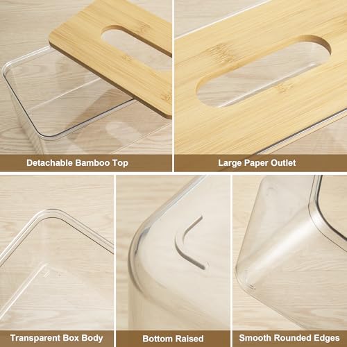 - [Humanised Design] The top bamboo cover of this tissue holder has a large oval opening, very easy to extract tissues. The transparent plastic box body is chamfered with rounded corners, very comfortable to hold, and there is a non-slip detail on the bottom to prevent wear and tear