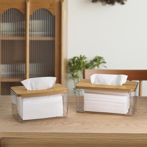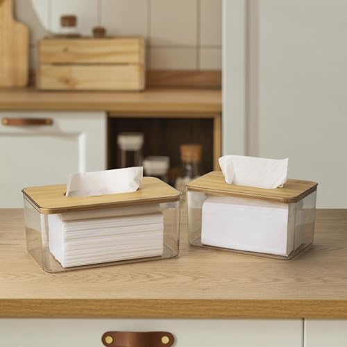 - [Stylish Look] Composed of a transparent box body and a wood-coloured bamboo cover, this tissue dispenser has a minimalist and stylish design that is not only pleasing to the eye, but also blends easily into the home environment without appearing monotonous