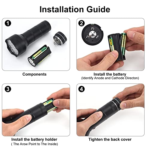 - 【محتويات العبوة】1 × مصباح يدوي بضوء الأشعة فوق البنفسجية، 1 × حبل قصير، 3 × بطاريات. - - - يُرجى شراؤه بكل ثقة. نصيحة ودية: من أجل إطالة عمر المصباح اليدوي، يجب إيقاف تشغيله وإزالة البطارية عندما لا يكون قيد الاستخدام.