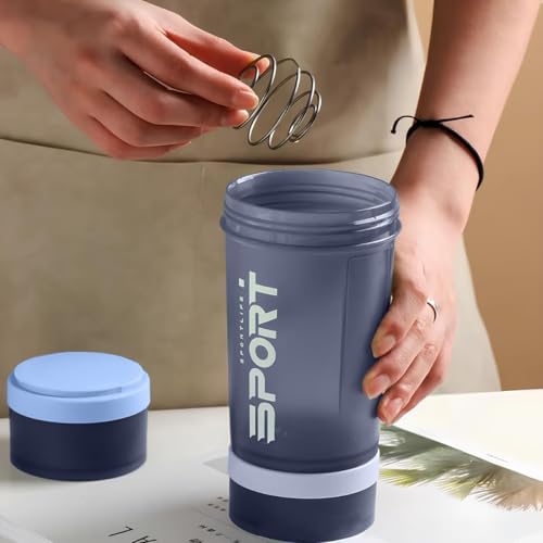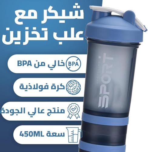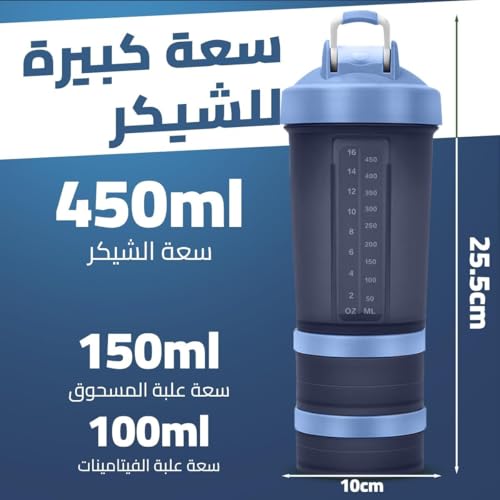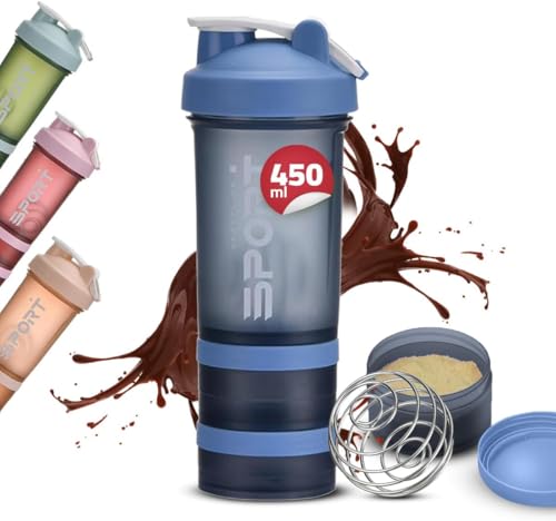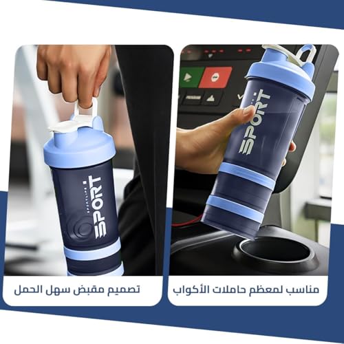Qshop - Qshop Shaker Bottle with Pill Organizer & Protein Powder Storage - 3 Layer Sports Water 450ml Leakproof Lid BPA Free Twist & Lock Containers - Perfect for Gym & Fitness Pink (Blue)