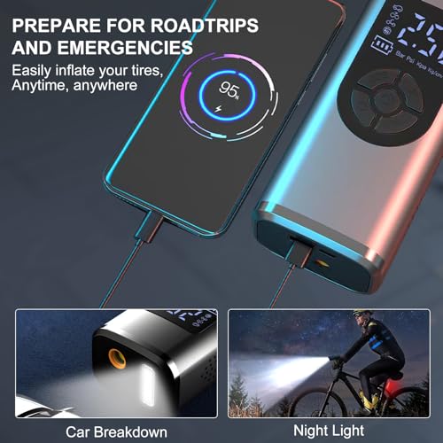 - 【Multifunctional Air Compressor】In addition to serving as an portable air compressor, it is also a multifunctional emergency tool. It has an LED light at the top that can be used to inflate in the dark, change tires, or warn other vehicles at night. The top also includes a C-type charging port and a 5V/2A USB output port, allowing it to serve as an emergency power source for electronic devices.