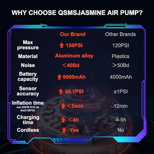 - 【Accurate Pressure Detecting & Auto Stop】- The QSMSJASMINE tire air pump for car is equipped with an upgraded high precision chip,providing accurate air pressure detection. Large LCD digital display enables you to read the real-time pressure and the preset pressure at just a glance.The car tire air pump will automatically shut down when the preset pressure is reached, making it simple and safe.No need to worry about over inflating.