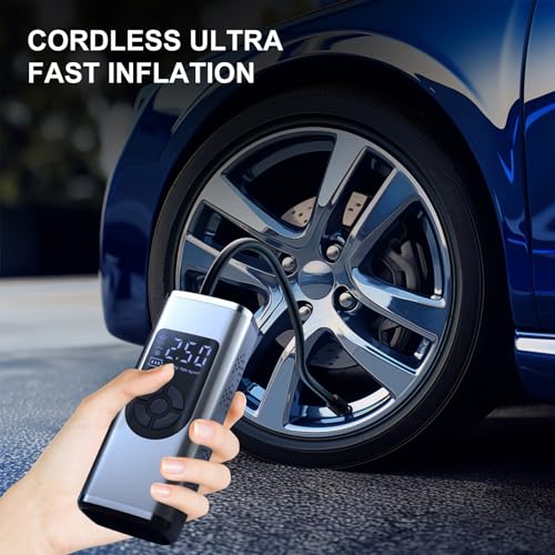 - 【Portable Design】The cordless tire inflation machine adopts a compact cordless design and is compact in size. It is equipped with a storage bag for easy storage in cars, bike racks, or backpacks and is very suitable for inflating during travel or at home. This inflator can be operated wirelessly and also through wired connection, ensuring it can be used in emergencies even when the battery is depleted.The cordless tire is a must-have product for drivers, cyclists, and adventurers.