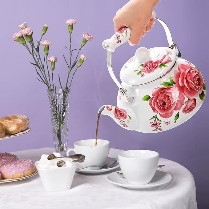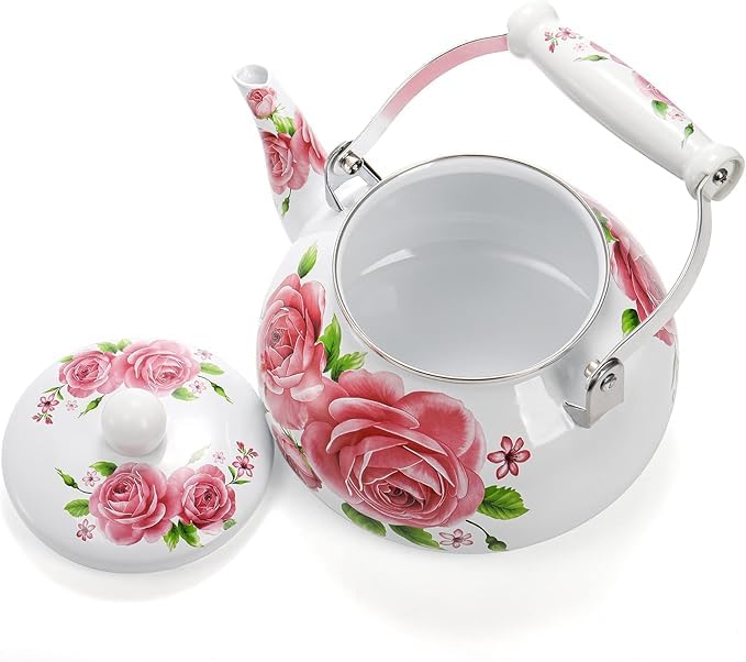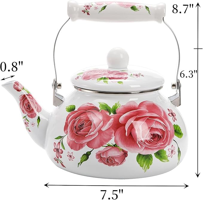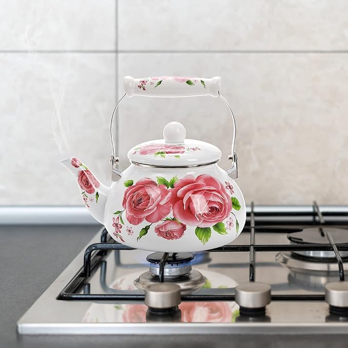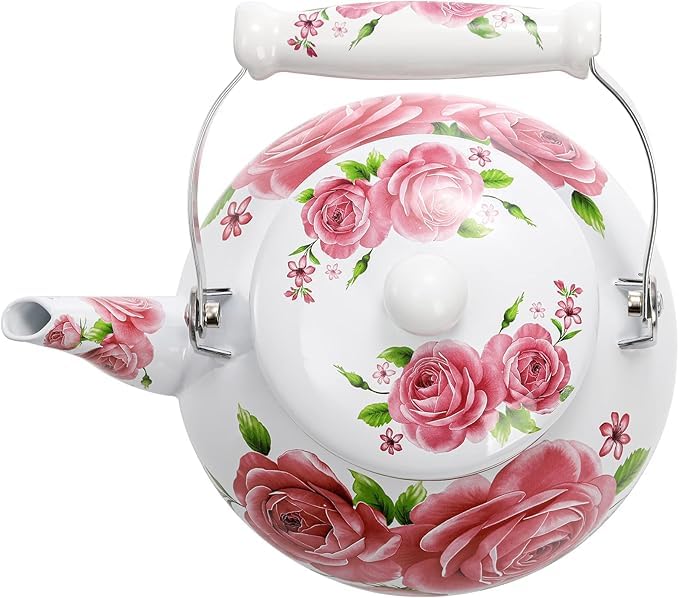 Generic - ابريق شاي مطلي بالمينا سعة 2.5 لتر مع مقبض من البورسلين بلون زهري عتيق بنمط زهور، غلاية ماء من الستيل بتصميم لطيف ورقيق سعة 2.5 لتر